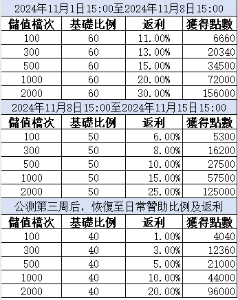 ->公測第一周(2024年11月1日15:00至2024年11月8日15:00),贊助基礎比例為1CNY=60點數,所有贊助檔次返利在贊助基礎上增加 10 %