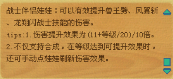 →【戰士伴侶娃娃:提升獸王劈、鳳翼斬、龍翔閃,戰士技能傷害,一小時消耗1點耐久度,六小時消耗5點耐久度】(後續更新會根據實際傷害情況進行調整);